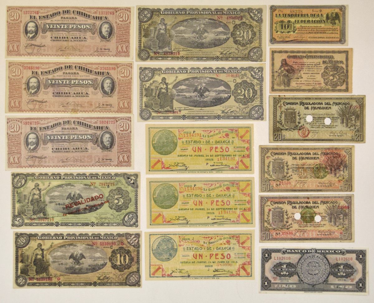 Mexico, 1914-61. Lot of 16 Issued Banknotes, Includes: El Estado de Chihuahua, 1915, 20 Pesos, P-S537a (3), MI-CHI-64; Gobierno Provisional de Mexico, Mexico, 1914, 5 Pesos, P-S702b MI-DF-30; Gobierno Convencionista de Mexico, 1915, 5 Pesos, P-S909a SI-MOR-16; La Tesoreria General del Estado de Oaxaca, 1915, 1 Peso, P-S953a (3), SI-OAX-8; La Tesoreria de la Federacion, Guaymas, 1914, 10 Centavos, P-S1058 SI-SON,4; Gobierno Provisional de Mexico, Veracruz, 1914, 10 Pesos, P-S1107a MI-VER-37; 20 Pesos, P-S1111a MI-VER-48; 20 Pesos, P-S1113a MI-VER-50; Comision Reguladora del Mercado de Neneguen y la Tesoreria General del Estado, 1914, 20 Centavos, P-S1120b; 20 Centavos, P-S1121a PI-YUC-6 and P-S1121c; Banco de Mexico, 1961, 1 Peso, P-59g, ABNC. Notes range from Choice VF to Uncirculated or better condition with a majority in the AU to Choice AU condition. (16). Sold "AS IS" no returns accepted.