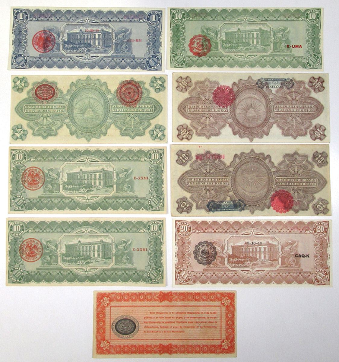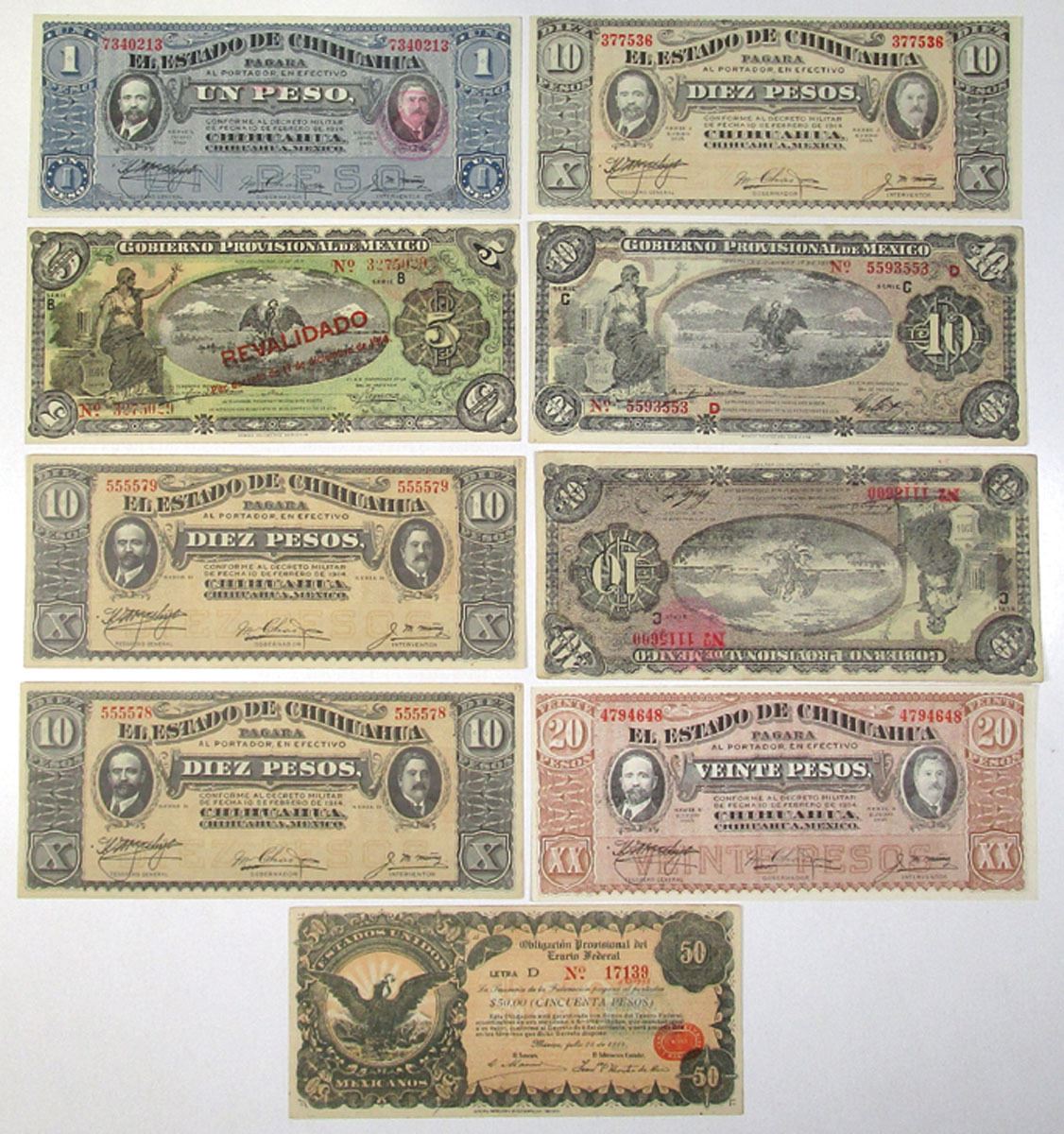 Mexico, 1914 to 1915. Lot of 9 Issued Banknotes, Includes: El Estado de Chihuahua, 1915, 1 Peso, P-S530d; D.1914, 10 Pesos, P-S533c (2), MI-CHI-58; 1915, 10 Pesos, P-S535c, MI-CHI-62; 1915, 20 Pesos, P-S537b; Gobierno Provisional de Mexico, 1914, 5 Pesos, P-S702b, MI-DF-30; 1914, 10 Pesos, P-S1108g (2), MI-VER-44; Obligacion Provisional del Erario Federal, 1914, 50 Pesos, P-S716, SI-DF-4. Notes range from VF to AU condition. Attractive assortment. (9). Sold "AS IS" no returns accepted.