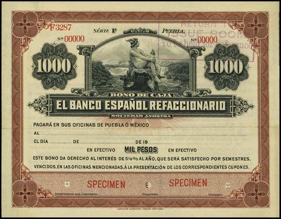 ND, (ca.1908). P-Unlisted. 1000 Pesos Specimen of extremely rare and attractive note that is not listed in Pick catalog. Red specimen overprint, POC and "00000" serial numbers. Vignette of Mercury in front of factory. Back has denomination. 6 coupons on right. Black with brown border. Unc. ABNC.