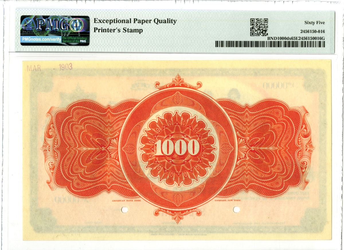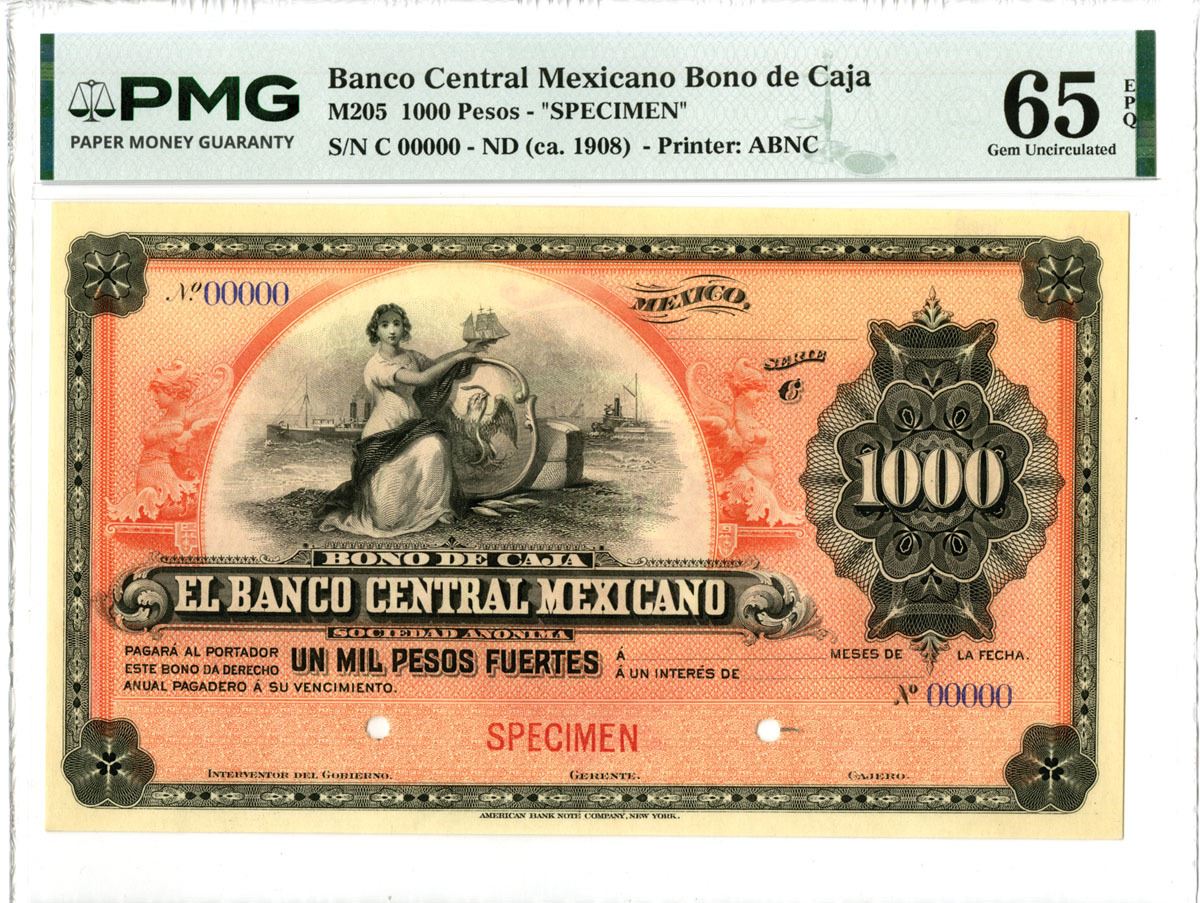 Mexico, ND (1908). 1000 Pesos, P-Unlisted M205, Series C, Specimen Banknote, Black and red/orange print with seated allegorical figure beside shield at right with harbor scene in rear, Back is orange-red, Specimen overprints and POC's, S/N C 0000, PMG graded Gem Uncirculated 65 EPQ with comment "Printer's Stamp", ABNC.