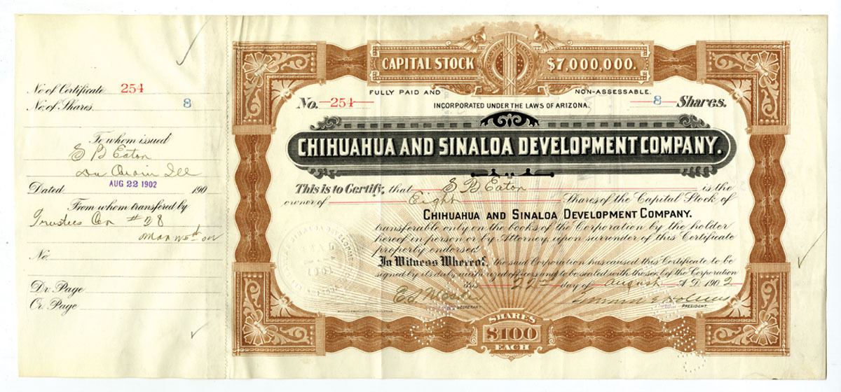 Mexico (Inc. in Arizona). 8 Shares Capital Stock I/C Certificate, Black print on brown border and under tint, Company title at top, Pin punched cancelled, Fine-VF condition, .