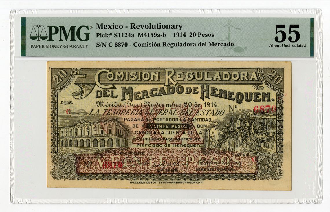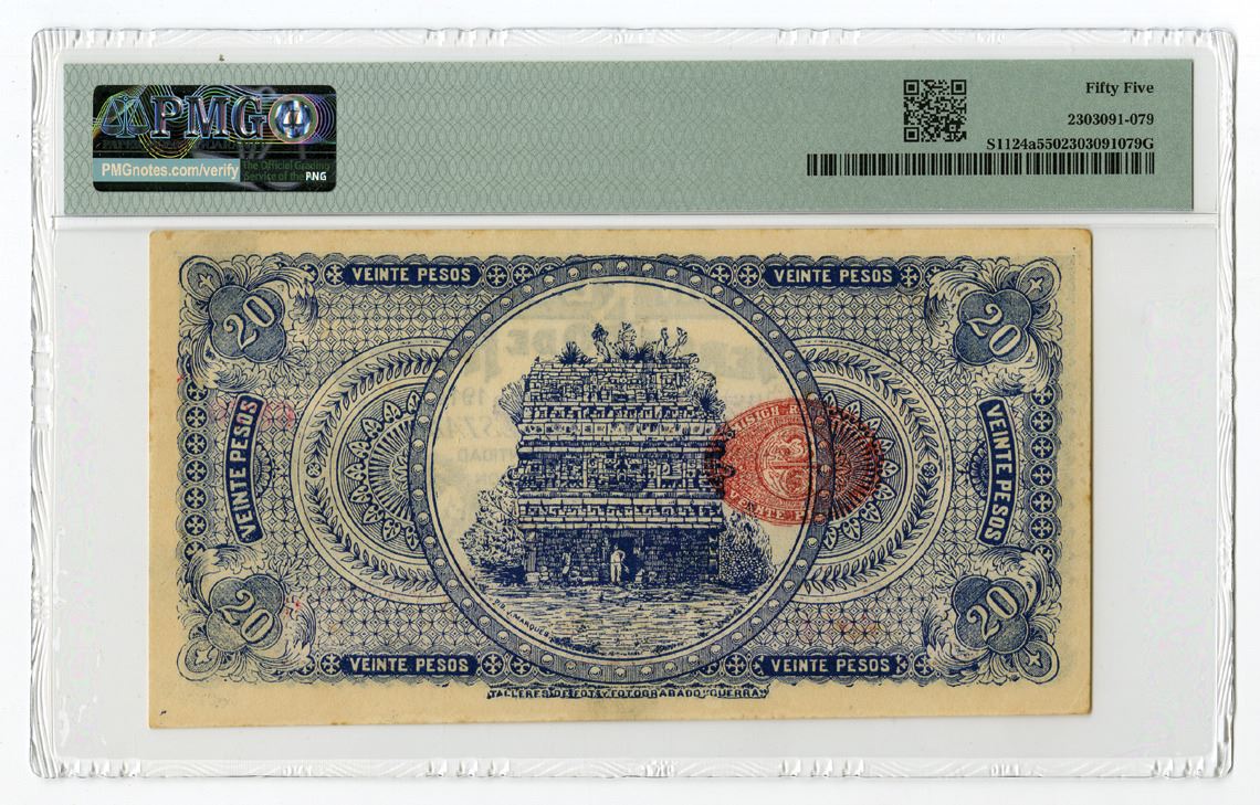 Merida, Mexico, 1914. 20 Pesos, P-S1124a M4159a-b PI-YUC-12, Issued Banknote, Black on yellow and brown underprint, Government building at left and sisal harvesting at right, Back is blue with ancient ruins at center, S/N C 6870, PMG graded About Uncirculated 55.