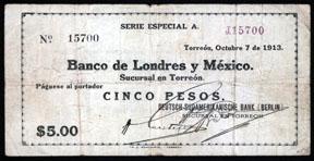 Torreon. October 7, 1913. 5 Pesos. Series A. P-S573b Issued banknote. Serial #15700. Fine to Fine+ condition. Printer: M-Torreon. Rare revolutionary period banknote.