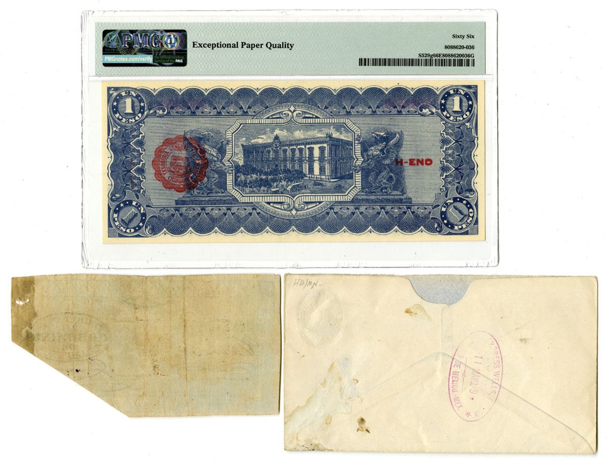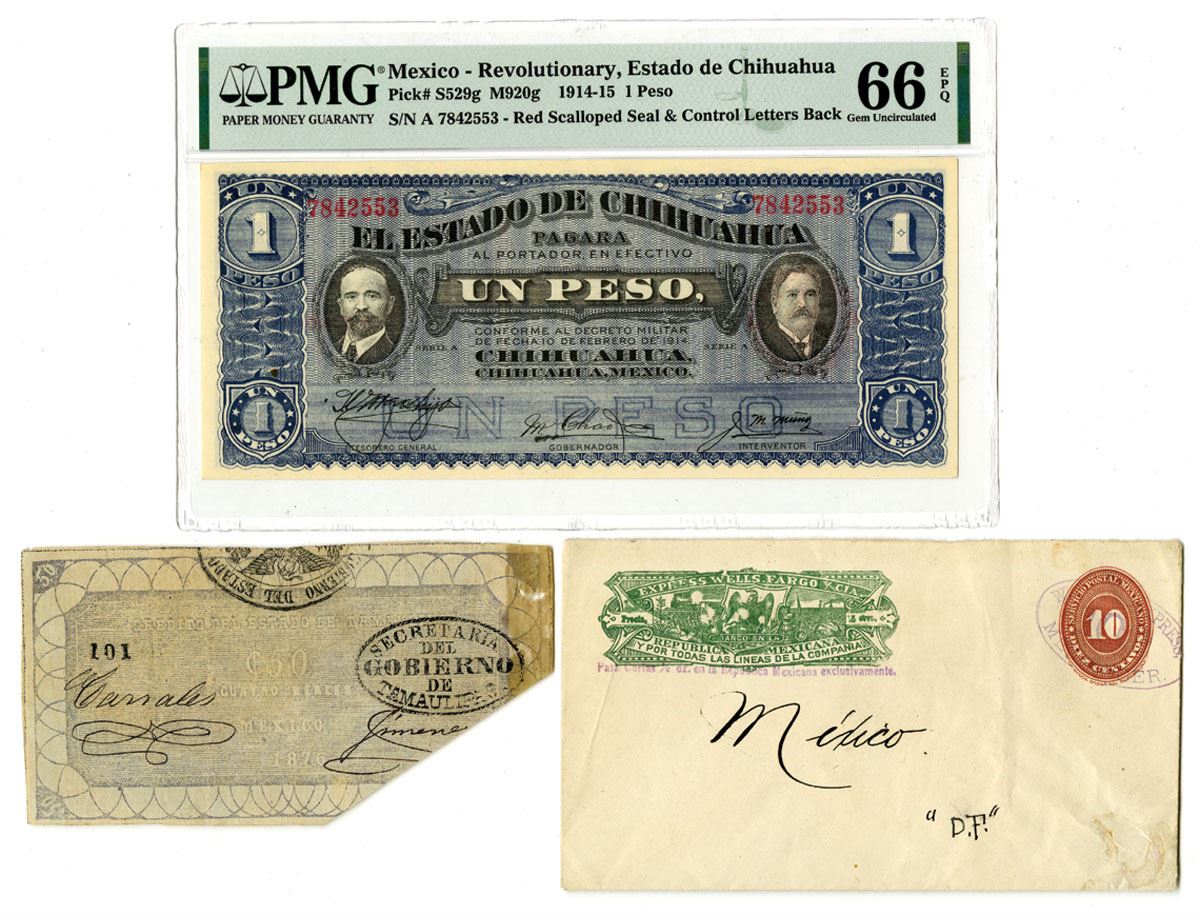 Mexico, 1876-1914. Lot of 3 Items, Includes: 1876, Credito del Estado de Tamaulipas, 50 Centavos, P-S428C, I/C Banknote; 1911, Mexican Cover with Wells Fargo stamp at top left corner and 10 Centavo Postage stamp at right; and, 1914, Estado de Chihuahua, 1 Peso, P-S529g M920g, PMG graded Gem Unc 66 EPQ. (3).