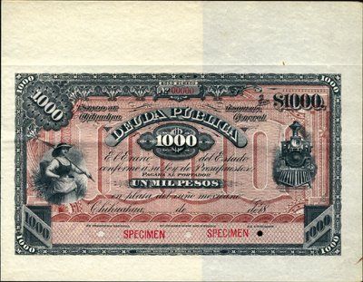 Chihuahua, Mexico. Estado De Chihuahua, Tesoreria General. Deuda Publica. 18--, (ca.1870's-80's). P-Unlisted. 1,000 Pesos. Specimen of unique and attractive banknote. Unlisted in SCWPM catalog. Notations indicate that this was possibly a circulating "Baby Bond", which would have been useful for currency as well as for savings. Red specimen overprint, POC's and "00000" serial numbers. Vignette of locomotive on right and woman with rake on left. Back is brown with Mexico arms. Counterfoil on left. Text on circulating bond states "El Erario del Estado conforme a su Ley de Presupuestos pagara al portador - Un Mil Pesos - en plata del cuno mexicano". Note appears choice uncirculated except for horizontal archival fold near upper middle of note due to archival storage. Large margins on note. This was all that was found in archive. ABNC.