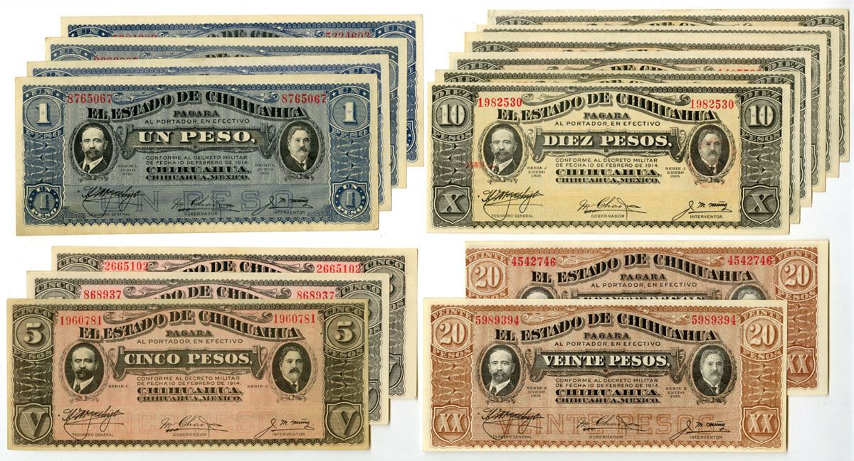 Mexico......, 19-1415. Lot of 15 Issued Banknotes, Includes: D. 1914, 1 Peso, P-S529g (4); D.1914, 5 Pesos, P-S531f; June 1915, 5 Pesos, P-S532A (2); Jan. 1915, 10 Pesos, P-S534b (2) MI-CHI-59; June 1915, 10 Pesos, P-S535a (2) & P-S535b (2); Jan. 1915, 20 Pesos, P-S537b (2). Notes are in AU to UNC condition. (15). Sold "AS IS" no returns accepted.