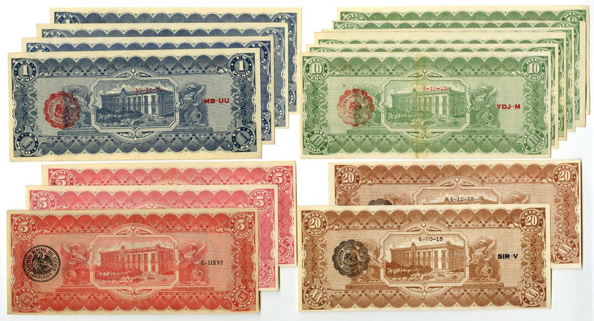 Mexico......, 19-1415. Lot of 15 Issued Banknotes, Includes: D. 1914, 1 Peso, P-S529g (4); D.1914, 5 Pesos, P-S531f; June 1915, 5 Pesos, P-S532A (2); Jan. 1915, 10 Pesos, P-S534b (2) MI-CHI-59; June 1915, 10 Pesos, P-S535a (2) & P-S535b (2); Jan. 1915, 20 Pesos, P-S537b (2). Notes are in AU to UNC condition. (15). Sold "AS IS" no returns accepted.