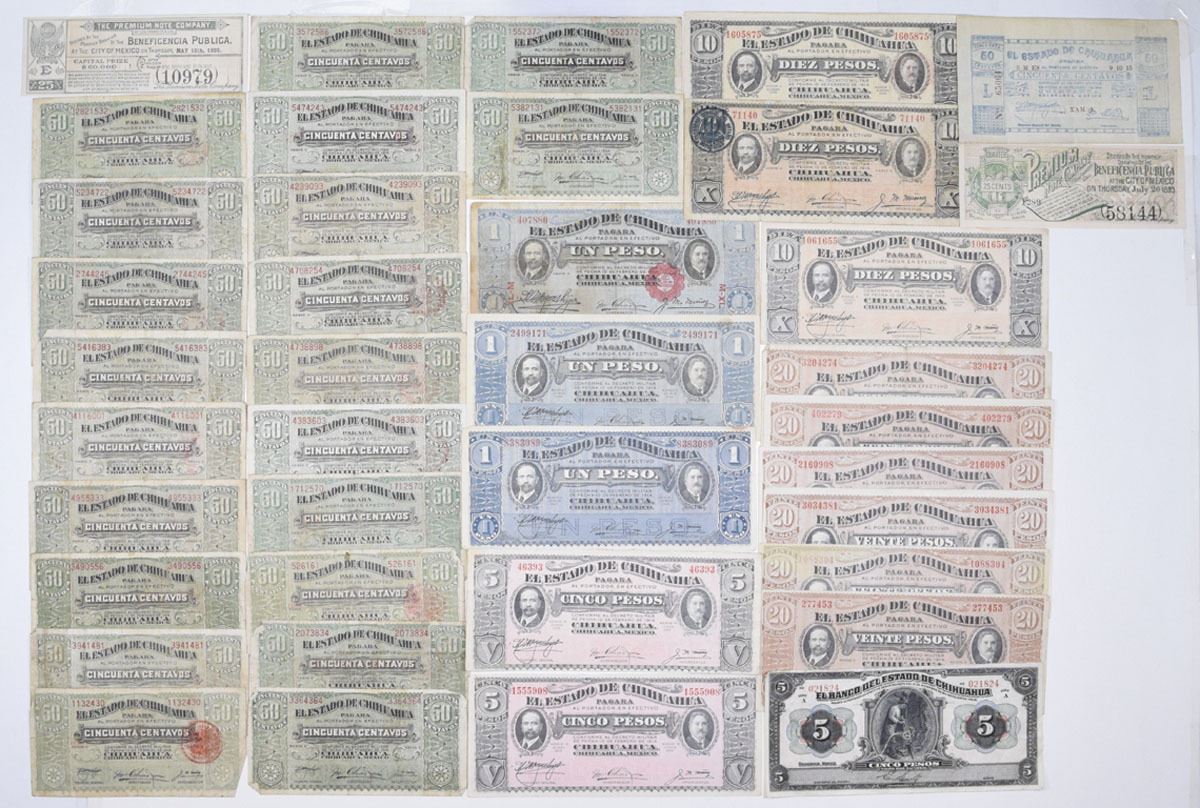 Mexico, D.1913-15. Lot of 38 Issued Banknotes, Includes: Banco del Estado de Chihuahua, D. 1913, 5 Pesos, P-S132a BK-CHI-148, ABNC; Estado de Chihuahua, 1915, 50 Centavos, P-S527a MI-CHI-37; D. 1914, 50 Centavos, P-S528 (20); D. 1914, 1 Peso, P-S529s MI-CHI-44; 1915, 1 Peso, P-S530b (2); 1915, 5 Pesos, P-S532A (2); 1914, 10 Pesos, P-S533b MI-CHI-57; 1915, 10 Pesos, P-S534b MI-CHI-59; 1915, 10 Pesos, P-S535b; 1914, 20 Pesos, P-S536b (2); 1915, 20 Pesos, P-S537a (4) MI-CHI-64; Lot also includes 2, 1893, 25 Cent lottery tickets from the Premium Note Company. Notes range from Fine to XF-AU condition. (38). Sold "AS IS" no returns accepted.