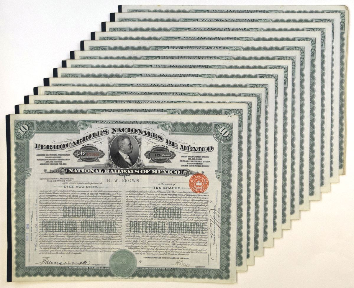 Mexico, 1909. 10 Shares, I/U, Second Preferred Nominative Group of 13 Stock Certificates, All have black printing on green border and underprint, Portrait of José de la Cruz Porfirio Díaz Mori at top (he was a Mexican general and politician that served seven terms as President of Mexico, a total of three and a half decades, from 1876 to 1880 and from 1884 to 1911), VF-XF condition. (13). Sold "AS IS" no returns accepted.