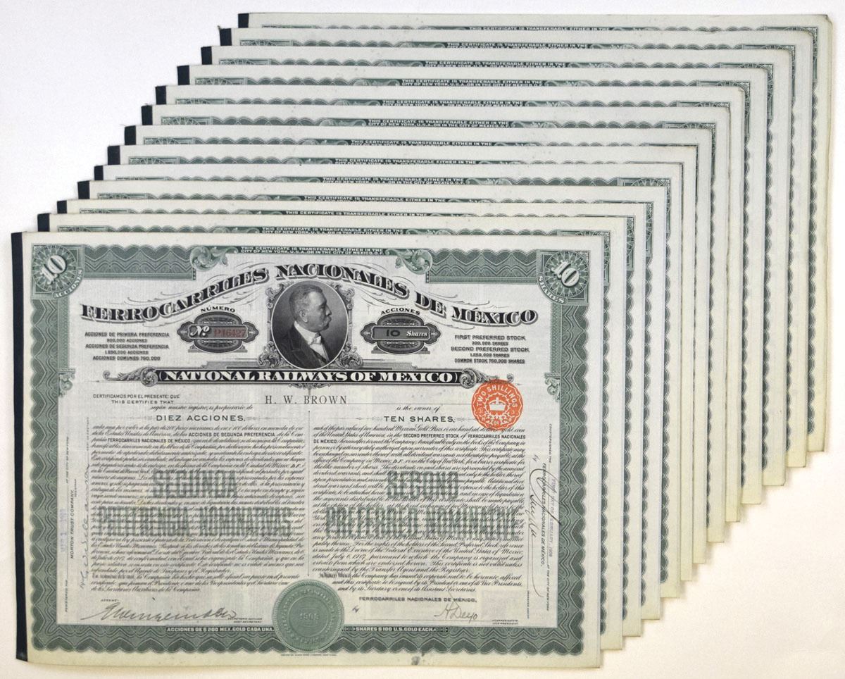 Mexico, 1909. 10 Shares, I/U, Second Preferred Nominative Group of 13 Stock Certificates, All have black printing on green border and underprint, Portrait of José de la Cruz Porfirio Díaz Mori at top (he was a Mexican general and politician that served seven terms as President of Mexico, a total of three and a half decades, from 1876 to 1880 and from 1884 to 1911), VF-XF condition. (13). Sold "AS IS" no returns accepted.