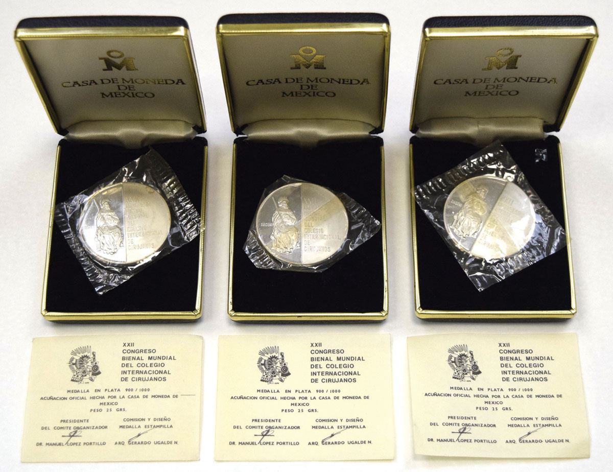 Mexico, 1980. Lot of 3 silver commemorative medals struck by the Casa de Moneda de México, Each medal is struck in .900 fine silver and weighs 25 grams per coin, The total weight of the three medals is 75 grams, Actual Silver Weight (ASW) per coin is 22.5 grams (.900 × 25 g), with a total ASW of 67.5 grams for all 3 coins (2.17 Troy Ounces) with a melt of $173 with silver at $80 per ounce. Medals remain in their original presentation packaging, with certificates of authenticity included. Condition appears Choice Uncirculated. (3). Sold “AS IS” no returns accepted.