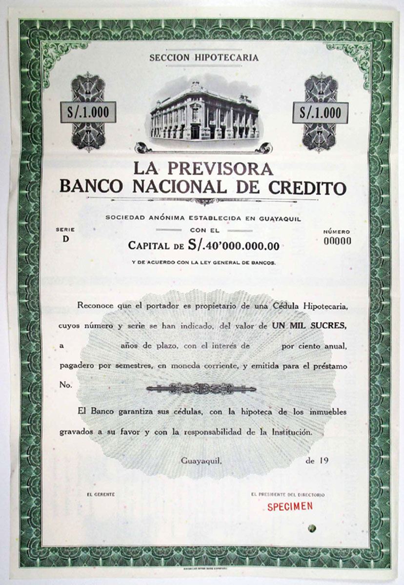 Guayaquil, Ecuador. La Previsora Banco Nacional De Credito, 1950s S/1000 Specimen Coupon Bond, VF. Ecuador. Odd% Coupon Bond, Black print with green border and undertint, Red specimen overprint, and POC. La Previsora Banco Nacional de Credito was one of the largest private commercial banks in 1958.