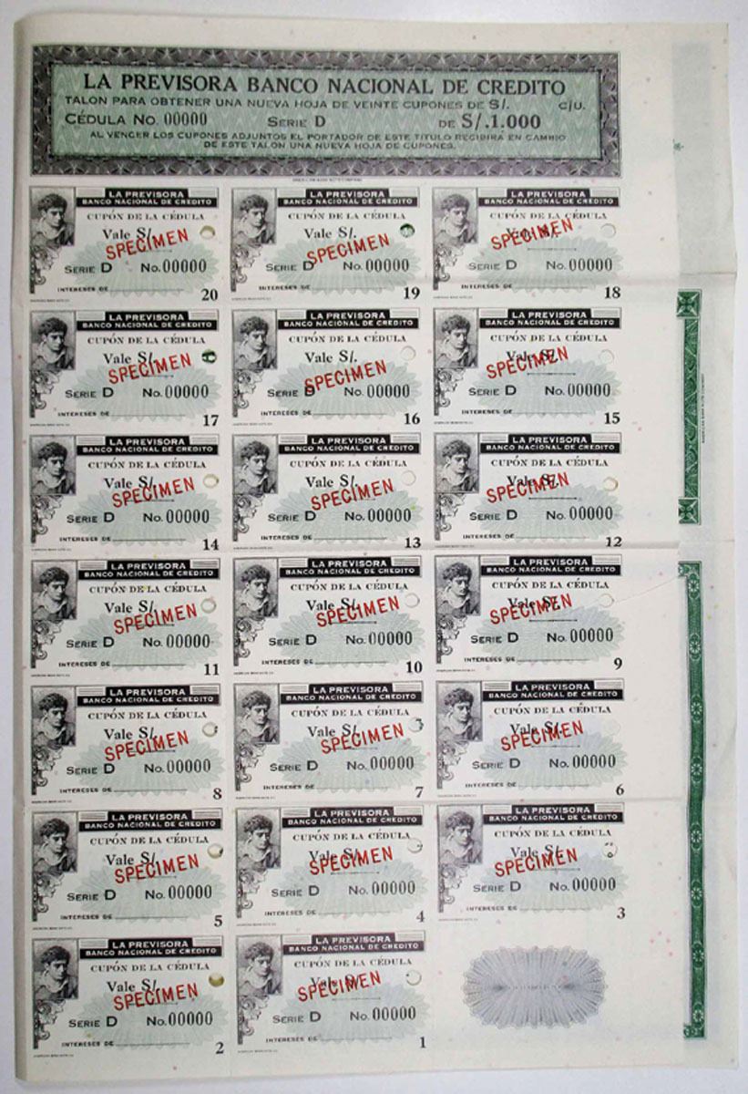 Guayaquil, Ecuador. La Previsora Banco Nacional De Credito, 1950s S/1000 Specimen Coupon Bond, VF. Ecuador. Odd% Coupon Bond, Black print with green border and undertint, Red specimen overprint, and POC. La Previsora Banco Nacional de Credito was one of the largest private commercial banks in 1958.