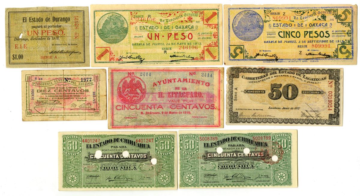 Mexico, 1913-22. Lot of 8 Issued Banknotes, Includes: Estado de Chihuahua, 1914, 50 Centavos, P-S528e (2); Tesoreria General del Estado, 1913, 10 Centavos, P-S550 MI-CHI-5; Estado de Durango, 1913, 1 Peso, P-S726a SI-DUR-11; Tesoreria General del Estado de Oaxaca - Oaxaca de Juarez, 1915, 1 Peso, P-S953a Si-OAX-8; 5 Pesos, P-S954 Si-OAX-11; Ayuntamiento de la H. Zitacuaro, 1915, 50 Centavos, P-Unlisted; Carreteras del Estado de Zacatecas, 1922, 50 Pesos, P-Unlisted. Notes are in Fine to VF+ condition. (8). Sold "AS IS" no returns accepted.