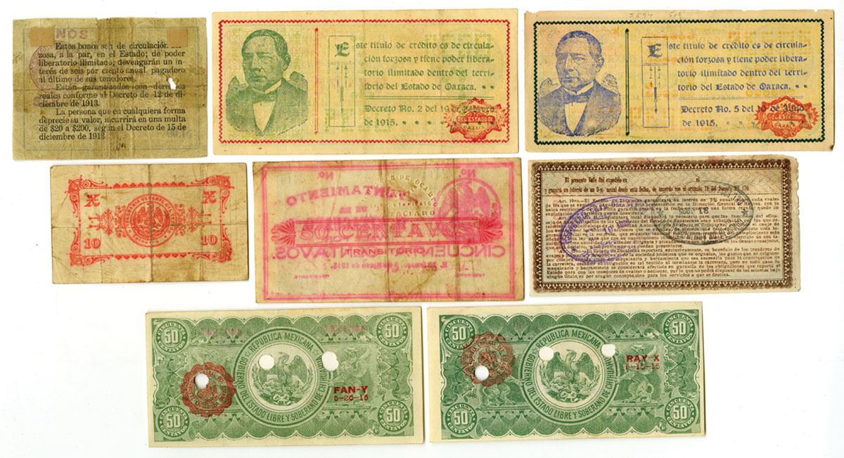 Mexico, 1913-22. Lot of 8 Issued Banknotes, Includes: Estado de Chihuahua, 1914, 50 Centavos, P-S528e (2); Tesoreria General del Estado, 1913, 10 Centavos, P-S550 MI-CHI-5; Estado de Durango, 1913, 1 Peso, P-S726a SI-DUR-11; Tesoreria General del Estado de Oaxaca - Oaxaca de Juarez, 1915, 1 Peso, P-S953a Si-OAX-8; 5 Pesos, P-S954 Si-OAX-11; Ayuntamiento de la H. Zitacuaro, 1915, 50 Centavos, P-Unlisted; Carreteras del Estado de Zacatecas, 1922, 50 Pesos, P-Unlisted. Notes are in Fine to VF+ condition. (8). Sold "AS IS" no returns accepted.