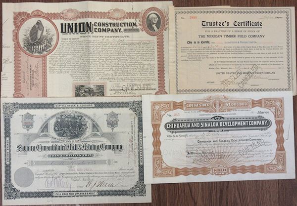 Mexico. Lot includes 4 pieces: Union Construction Company 1903, 15 Shares I/C Capital Stock Certificate in brown; Chihuahua and Sinaloa Development Co. 1902, 8 Shares I/C Capital Stock Certificate in brown; Sonora Consolidated Mill & Mining Co. 1883 I/U Capital Stock Certificate in black; Mexican Timber Field Co. 1907 50/100 Shares I/C Capital Stock Certificate with small blue border. All are Fine-VF condition. (4)