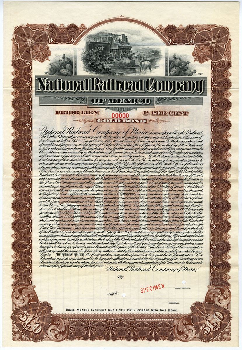 Mexico, 1902. $500 Specimen 4 1/2% Prior Lien Gold Bond, Black text with ornate brown border and underprint, Scene at top of train passing by man on horse, flanked by cacti. Red specimen overprint, "00000" serial number, POCs, VF-XF condition, printed by International BNC.