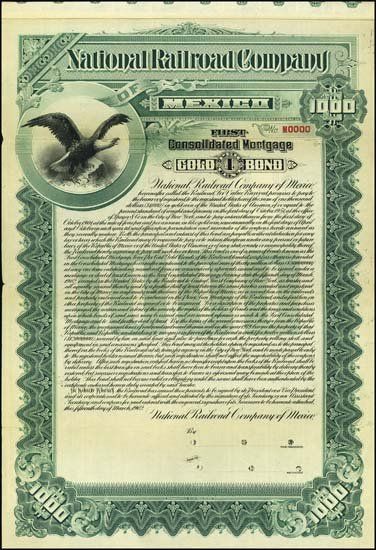 1902. Specimen bond. $1000. 1st Consolidated Mortgage 4% Gold Bond. Green border and undertint. Eagle on left. Coupons attached. Red "0000" and POC's. XF condition. Rare and attractive bond. International BNC.