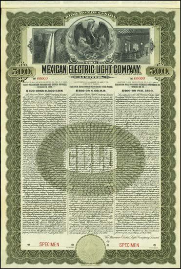 Montreal. 1905. $500 5% 1st Mortgage Gold Bond. Brown border and undertint. Vignette of Arms of Mexico with eagle with snake in beak, flanked by waterfall and dynamos. Red SPECIMEN overprint and POC. Coupons attached. VF condition. ABNC. Mexican company incorporated in Canada.