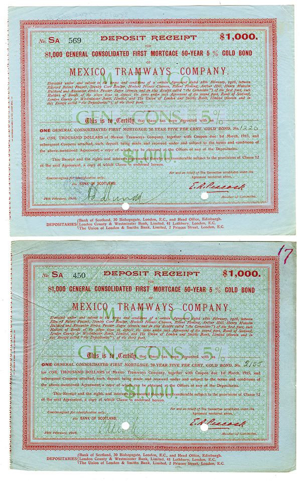 Mexico. 2 Pieces. Pair of $1000 Cancelled 5% General Consolidated 1st Mortgage Deposit Receipt, Red print on red border with green under tint, Company titles at top, VF-XF condition with POC's.