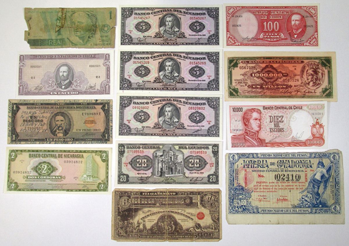 South America, 1920s to 1988. Lot of 13 Issued Banknotes from Chile, Ecuador, Mexico, Nicaragua, Dominican Republic, and Brazil. Mexico includes a large lottery ticket and a Feliz Ano Nuevo banknote, Notes range from VG to Uncirculated condition. (13). Sold "AS IS" no returns accepted.