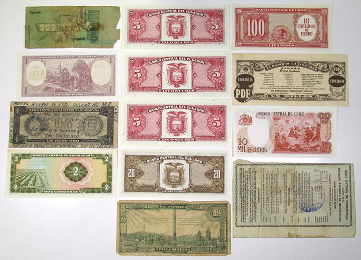 South America, 1920s to 1988. Lot of 13 Issued Banknotes from Chile, Ecuador, Mexico, Nicaragua, Dominican Republic, and Brazil. Mexico includes a large lottery ticket and a Feliz Ano Nuevo banknote, Notes range from VG to Uncirculated condition. (13). Sold "AS IS" no returns accepted.
