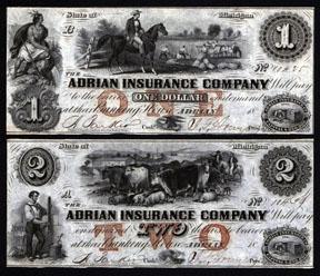 Lot of 2 notes. Adrian, MI. 18xx. (ca.1850's). Both are almost fully issued except they are missing dates and both have black on light red underprint. The $1 (AS-195-G2a) has vignettes of man on horse watching workers in middle and native American on left and the $2 (AS-195-G4a) has farm animals with small train in background in middle and mason building wall on left. Both are in Unc. to CU. Scarce and attractive high grade pair. TCC&C.