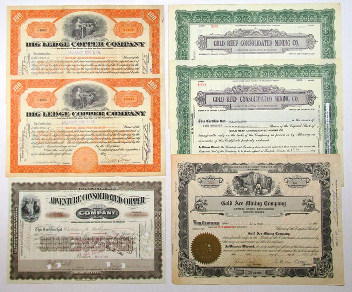 Michigan, Arizona, & Nevada, 1902-29. Lot of 6 Mining Related Stock Certificates, Includes: Adventure Consolidated Copper Co., Big Ledge Copper Co. (2), Gold Ace Mining Co., Gold Reef Consolidated Mining Co. (2). Certificates range from Fine to VF+ condition. (6). Sold "AS IS" no returns accepted.