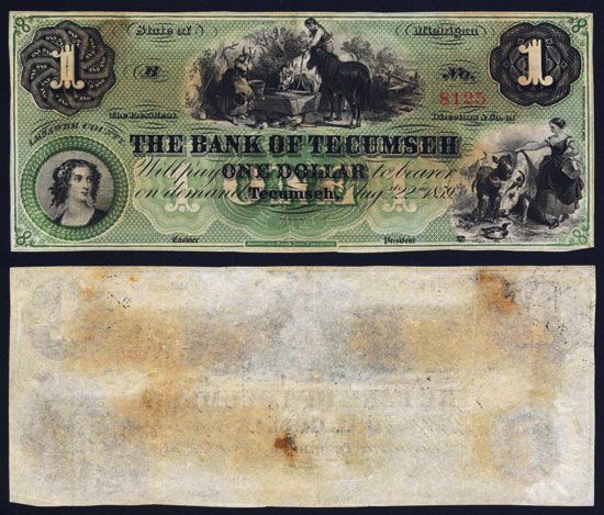 Tecumseh, MI, 1859, $1, MI-435-G22a, Unissued banknote, Black on full green underprint, Young man and woman watering horses top middle, milk maid LR, young woman LL, S/N 8125, pp B, XF to XF+ with light glue stains on back, Colorful and very attractive, ABNC.