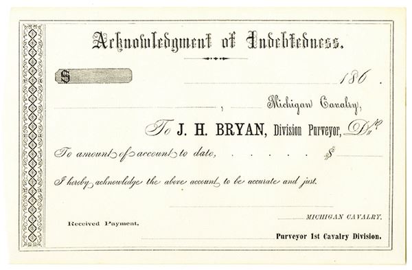 Michigan, 1860s. Michigan Cavalry, J.H. Bryan Division Purveyor. Sutler, Acknowledgement of Indebtedness Form. Late 1860s.This document is a post Civil War item with J.H. Bryan named as Division Purveyor. Unissued Remainder. Uncirculated. Uniface. Printed on bond paper. For use at Fort Laramie, Dakota Territory. Although unissued, still scarce.