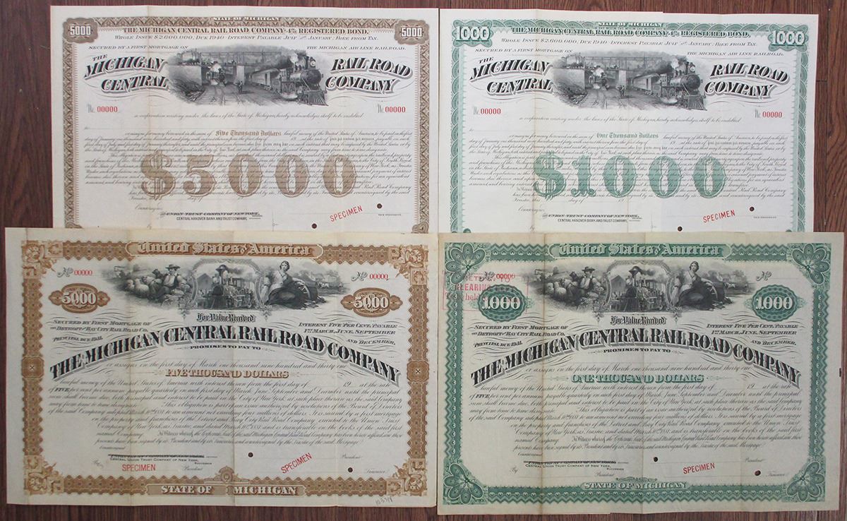 Michigan. Lot includes 4 pieces: $5000 Specimen 4% Registered Bond in brown; $1000 Specimen 4% Registered Bond in green; $5000 Specimen 5% First Mortgage Bond in brown; $1000 Specimen 5% First Mortgage Bond in green. All have red specimen overprints, 00000 serial numbers, and POCs. (4)