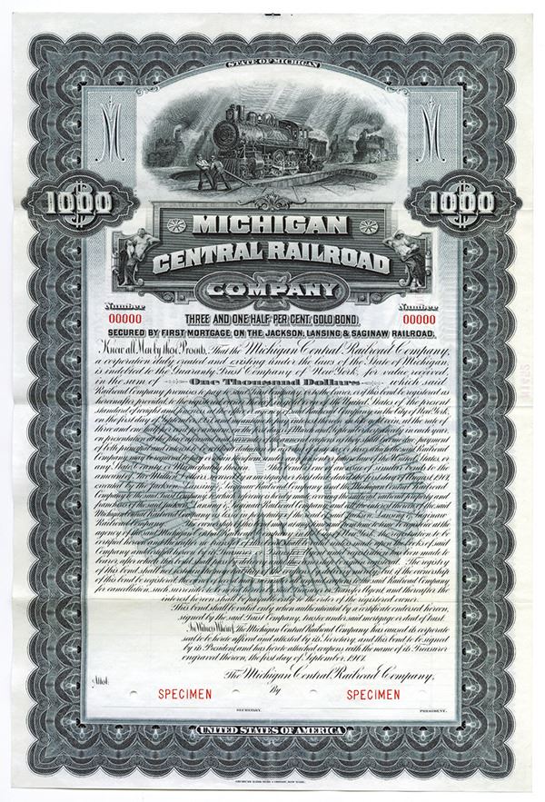 Michigan. $1000 Specimen 3 1/2% 1st Mortgage Gold Coupon Bond, Black print on blue/gray border and under tint, Men at top turning large engine on turntable at top, Specimen overprints and POC's, VF-XF condition, ABNC. Unlisted as a specimen in Cox and rare in this format.