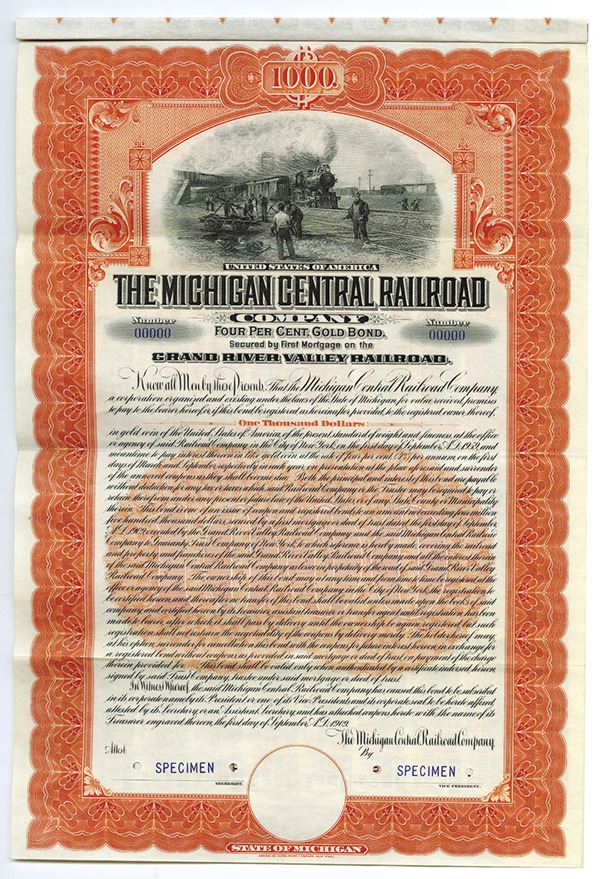 Michigan. $1000 Specimen 4% Secured by 1st Mortgage Coupon Bond, Black print on large orange border and under tint, Men repairing tracks with locomotive in background, Specimen overprints and POC's, VF-XF condition, ABNC. Unlisted as a specimen in Cox and rare in this format.