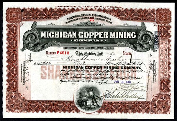 Michigan, 1909, 50 Shares, Issued and uncancelled, VF with ink stain on right, International BNC. Scarce Michigan mining certificate.