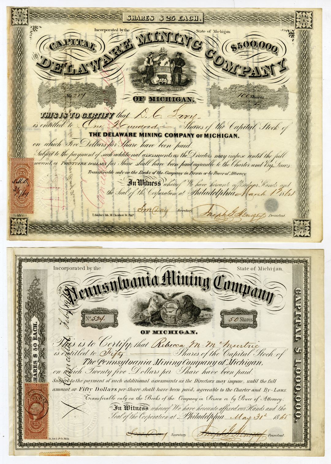 Michigan, 1864-65. Lot of 2 I/C Stock Certificates, Includes: 1861, Delaware Mining Co., 100 Shares Capital Stock I/C Certificate, Black on black border with seal of Michigan at top, Written cancelled along left margin, 25 cent revenue stamp at bottom left corner; and, 1865, Pennsylvania Mining Co., 50 Shares Capital Stock I/C Certificate, Black on black border with seal of Pennsylvania at top, Written cancelled along left margin, 25 cent revenue stamp at bottom left corner. Both are in VF-XF condition. (2). Sold "AS IS" no returns accepted.