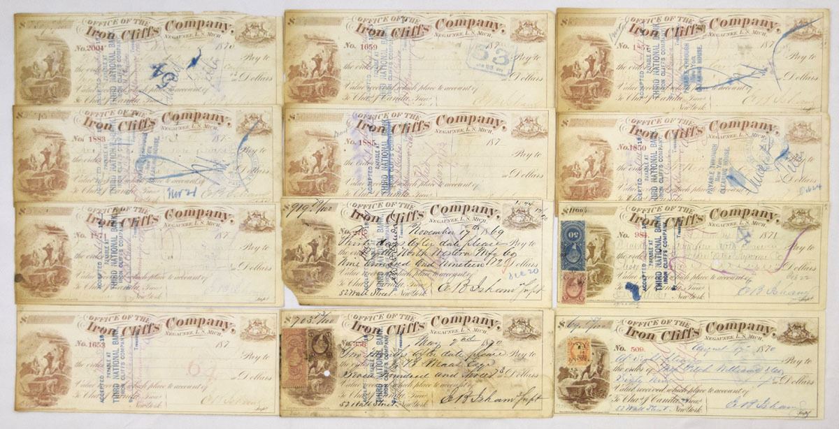 Negaunee, Michigan, 1870-73. Lot of 12 I/C drafts from Iron Cliffs Company representing early Upper Peninsula iron mining operations. All checks are drawn on New York banking houses and bear multiple blue Third National Bank of New York acceptance stamps, with several examples showing original revenue stamps. Designs feature the engraved mining vignette at left depicting industrial workers and equipment, with ornate period typography. Condition ranges from Fine to Very Fine overall, with folds, punch cancellations, edge wear, staining, and typical banking markings. (12). Sold “AS IS” no returns accepted.