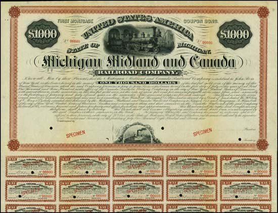 Specimen Bond. 1873. $1000. 1st Mortgage 7% Coupon Gold bond. Red brown border with train leaving train house and ferry steamboat on bottom. Rare early Michigan Railroad bond. Red specimen overprint,"000000" serial numbers and POC's. XF condition. National BNC. Horizontal bond.