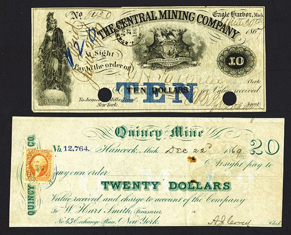 MI. Lot of 2 notes, Includes 1867 Eagle Harbor, MI., $10, Fine, POC's and 1869 Hancock, MI., $20 Spindle and ink cancelled, XF.