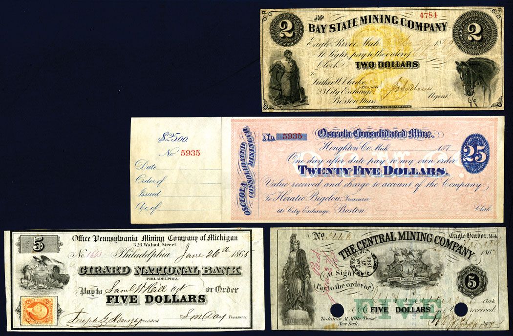 Lot of 4 notes, Includes Eagle River, MI, 1860's, $2, Issued, VG; Houghton Co., MI, 187x, $25, Osceola Consolidated Mine, Unissued, AU; and two others. All are VG to AU and attractive group.