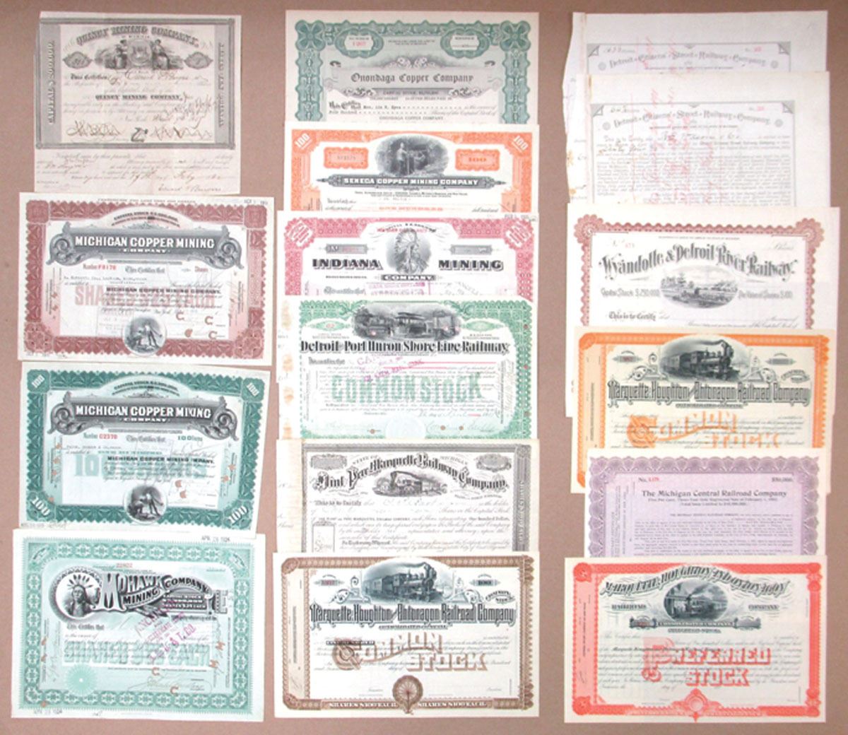 Michigan..., ca.1859-1930s. Lot of 16 Mining and Railroad Bonds and Shares Certificates, Includes: 1859, Quincy Mining Co.; 1915 and 1916, Michigan Copper Mining Co. Pair; 1912, Mohawk Mining Co.; 1923, Indiana Mining Co.; 1901, Detroit and Port Huron Shore Line Railway; 1870, Flint and Pere Marquet Railway Co.; 1880-90s, U/U, Marquette Houghton and Ontonagon Railroad Co., and more. Certificates range from VF to AU condition. (16). Sold "AS IS" no returns accepted.