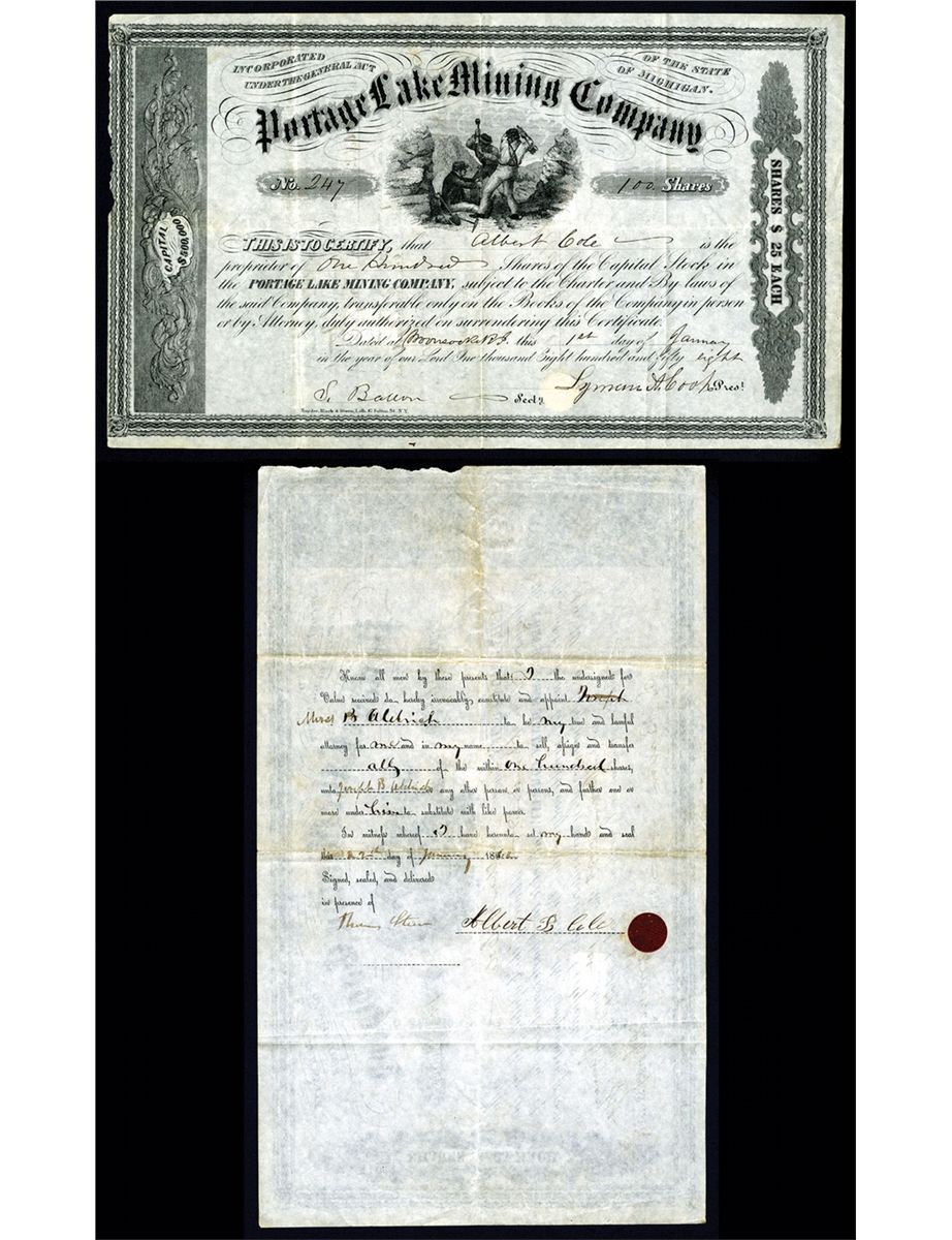 MI. 100 Shares, S/N 247, Issued and uncancelled banknote, Miners in middle, Issued in Woonsocket, Rhode island, VF condition, Rare Michigan mining certificate.