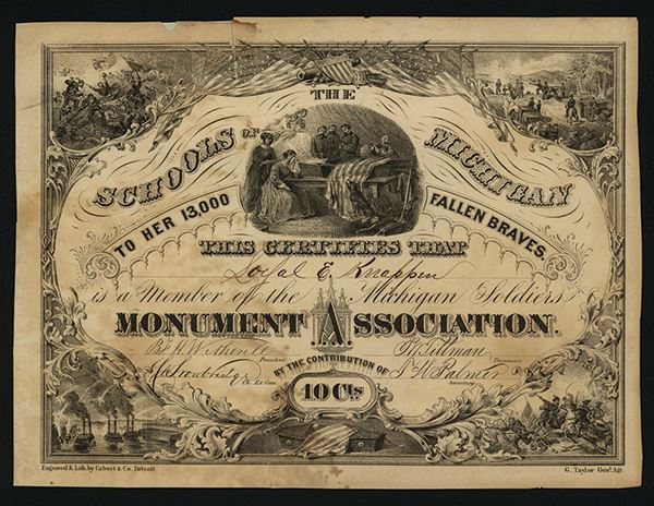 MI. ND (ca.1860's). Issued certificate for 10 cents. Black on light tan paper with multiple Civil War related vignettes including battles, in the 4 corners, a coffin on the bottom, U.S. flags and cannon on top middle with large vignette of widow with husbands coffin and U.S. flag. "The Schools of Michigan - to Her 13,000 Fallen Braves....". The certificate appears in VG to fine condition with light water staining or toning, 2 small repaired edge tears with paper backing on back in those areas. Facsimile signatures of well known Michigan notables including Civil War Generals. Printed by Calvert Lith. Scarce Civil War Memorial Certificate.