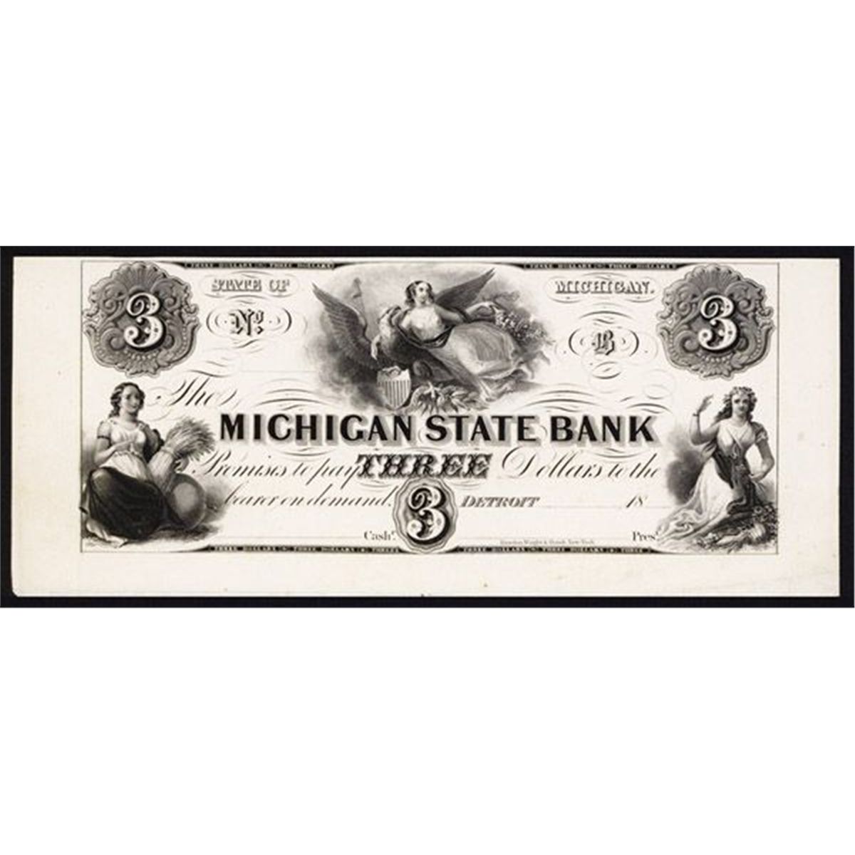 Detroit, Michigan, 18xx (ca.1830's), $3, Plate B, MI-150-G30, Unlisted in census, Proof banknote, Banknote printed in black on india paper on thin white card, Allegorical woman with arms around patriotic eagle and shield, lower left and right with allegorical women with wheat and produce, Choice to Gem Uncirculated condition with 3 jumbo margins on the bottom and sides with large margin. Rawdon, Wright & Hatch New York imprint. (Silver City Collection, Part 2)
