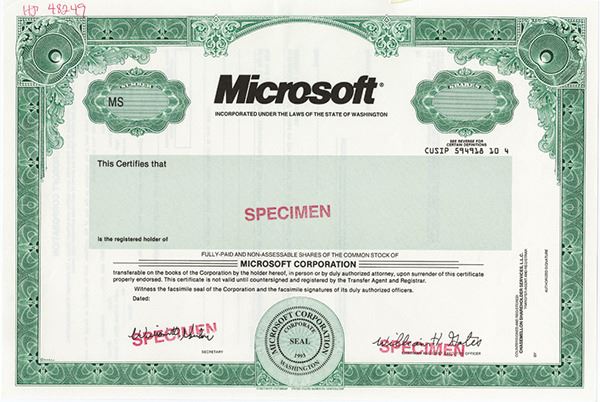Washington. Odd Shares Common Stock Specimen Certificate. Black print with an ornate green border and under print. Company logo/name at top of certificate. Specimen overprints, XF condition with archival notation at top left hand corner in margin. SC-BNC. Rare facsimile Bill Gates signature.