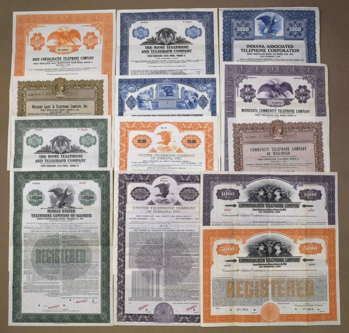 Illinois, Indiana, Wisconsin, Minnesota, Ohio, and Kansas, 1945-60. Lot of 13 Specimen Bonds from: Cincinnati and Suburban Bell Telephone Co (overprint with 'Name changed to Cincinnati Bell Inc.'); Home Telephone and Telegraph Co.; United Telephone Co. of Indiana, Inc., includes denominations of $106,500, and $355,000; Illinois, Middle States Telephone Co. of Illinois, includes the high denomination of $1,075,000; Western Light & Telephone Co. Inc.; Ohio Consolidated Telephone Co.; Commonwealth Telephone Co.; and, more. Bonds all have Specimen overprints, POCs, and are in AU to UNC condition. (13). WBNC, Northern BNC, ABNC.