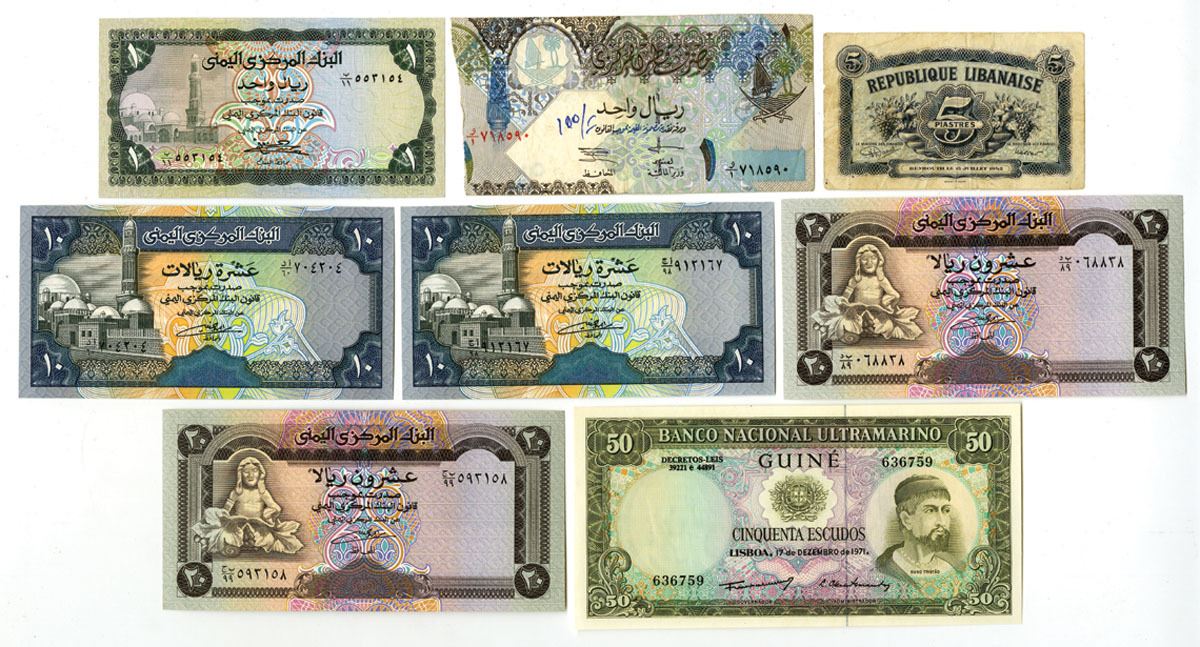 Middle East, Africa and Asia, 1942-2003. Lot of 8 Issued Banknotes, Includes: Banco Nacional Ultramarino, Guine (Portuguese Admin), 1971, 50 Escudos, P-44a; Republique Libanaise, 1942, 5 Piastres, P-34Fine to VF; Qatar Central Bank, ND (2003), 1 Riyal, P-20; Central Bank of Yemen, ND (1973), 1 Rial, P-11a; ND (ca.1992), 10 Rials, P-24 (2); ND (1990), 20 Rials, P-26 (2). All but the Lebanon banknote are in Uncirculated to CU condition. (8). Sold "AS IS" no returns accepted.