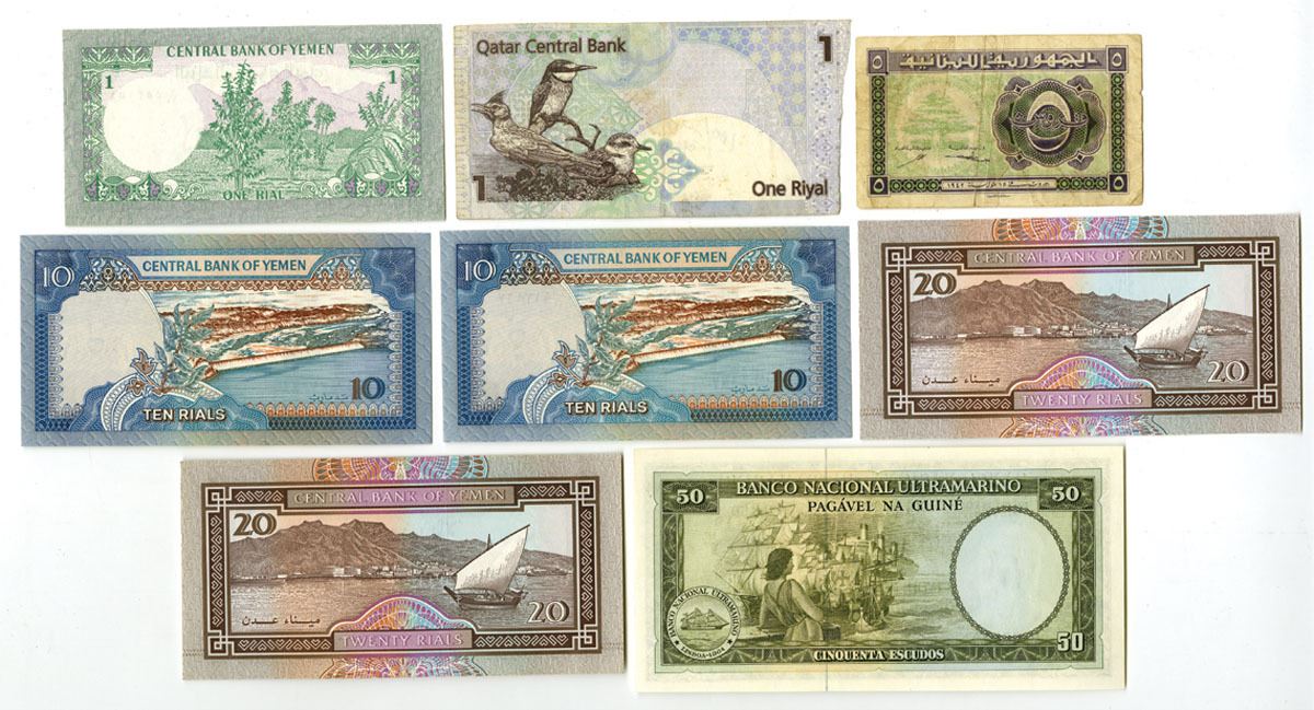 Middle East, Africa and Asia, 1942-2003. Lot of 8 Issued Banknotes, Includes: Banco Nacional Ultramarino, Guine (Portuguese Admin), 1971, 50 Escudos, P-44a; Republique Libanaise, 1942, 5 Piastres, P-34Fine to VF; Qatar Central Bank, ND (2003), 1 Riyal, P-20; Central Bank of Yemen, ND (1973), 1 Rial, P-11a; ND (ca.1992), 10 Rials, P-24 (2); ND (1990), 20 Rials, P-26 (2). All but the Lebanon banknote are in Uncirculated to CU condition. (8). Sold "AS IS" no returns accepted.