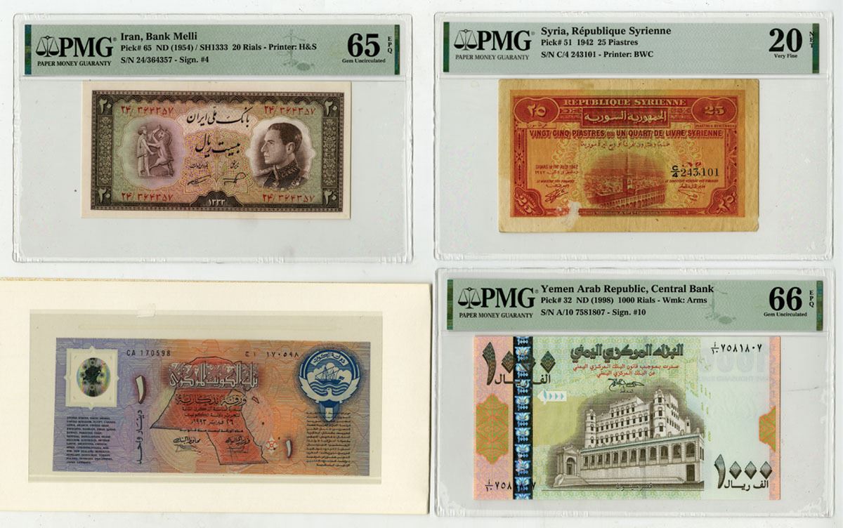 Iran, Syria, Yemen, and Kuwait. Lot of 4 Issued Banknotes, Includes Iran, Bank Melli Iran 20 Rials, P-65, SH1333/ND (1954), PMG graded Gem Uncirculated 65 EPQ, H& S; Syria, Republique de Syrienne 25 Piastres, P-51, 1942, PMG graded Very Fine 20 NET with comment "Previously Mounted, BWC; Central Bank of Yemen 1000 Rials, P-32, ND (1998), PMG graded Gem Uncirculated 66 EPQ; and, Central Bank of Kuwait 1 Dinar, P-CS1, 1993 Commemorative Banknote in folder with special envelope, Unc. condition. (4). Sold "AS IS" no returns accepted.