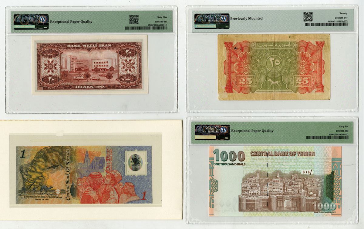 Iran, Syria, Yemen, and Kuwait. Lot of 4 Issued Banknotes, Includes Iran, Bank Melli Iran 20 Rials, P-65, SH1333/ND (1954), PMG graded Gem Uncirculated 65 EPQ, H& S; Syria, Republique de Syrienne 25 Piastres, P-51, 1942, PMG graded Very Fine 20 NET with comment "Previously Mounted, BWC; Central Bank of Yemen 1000 Rials, P-32, ND (1998), PMG graded Gem Uncirculated 66 EPQ; and, Central Bank of Kuwait 1 Dinar, P-CS1, 1993 Commemorative Banknote in folder with special envelope, Unc. condition. (4). Sold "AS IS" no returns accepted.