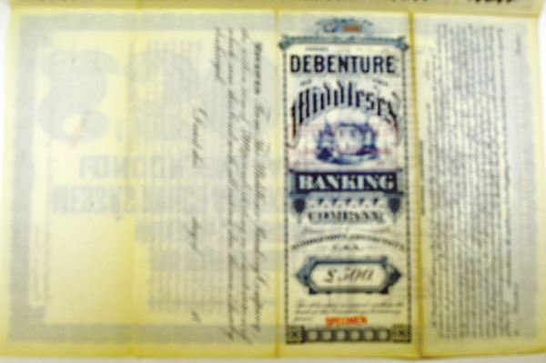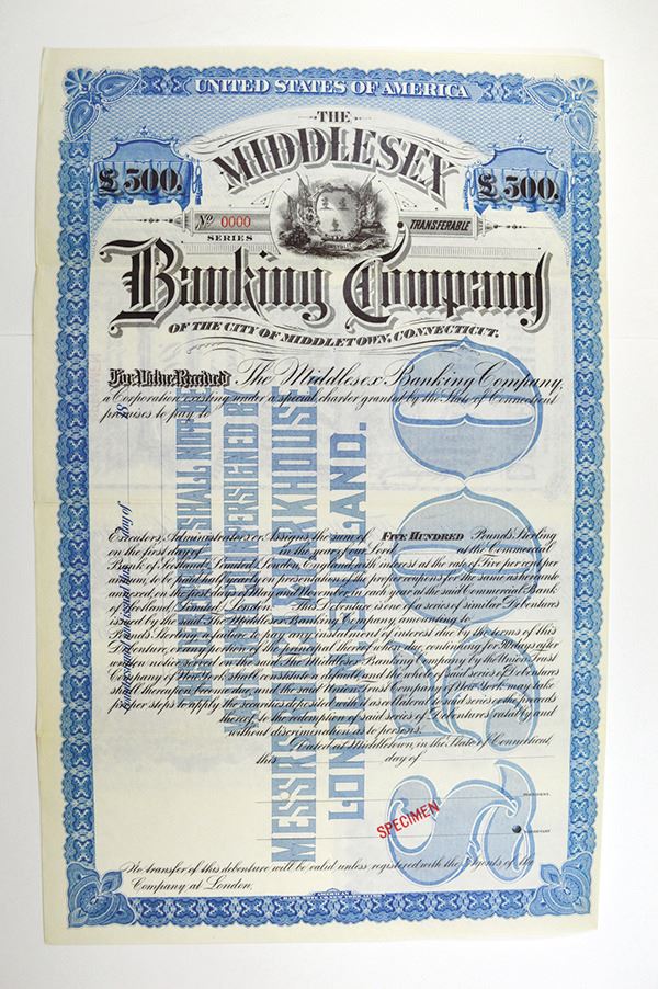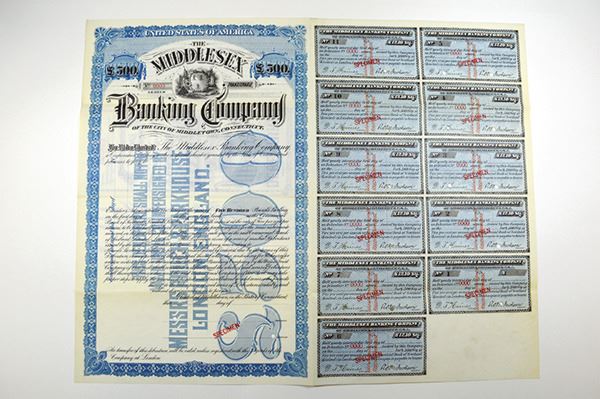Connecticut. $500 Pound Specimen Coupon Bond. Black ink with blue border and under print. Vignette of coat of arms at top of certificate. Specimen overprints, POC's, VF+, ABNC Litho.